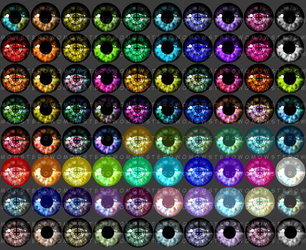 Eye Pack V17 : 238 Total Eye colours with a simple colourful design. 136 Default swatches. 102 Swatches with a cracked eye design. Some effect masks