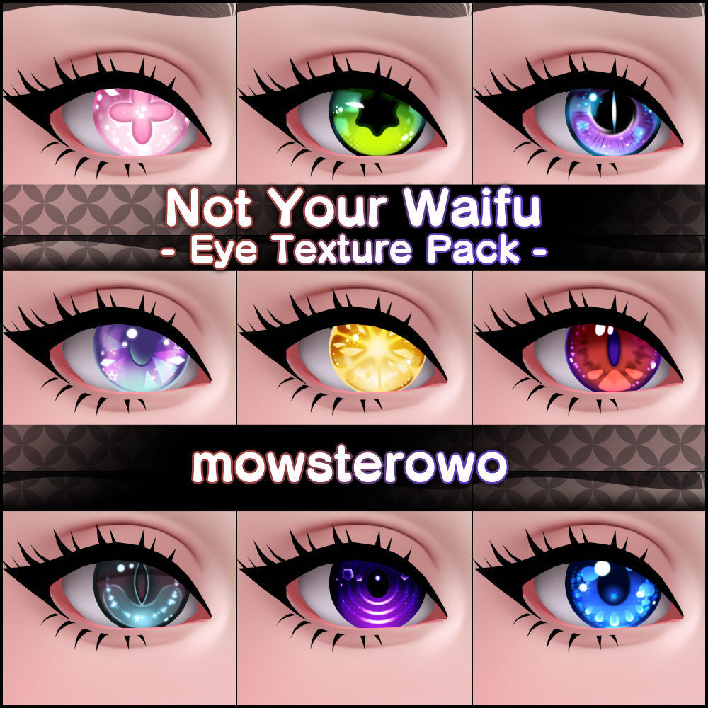This package includes 9 packs of eye textures. Designed to fit both Spherical Eye Shapes and The more common Circular Eye Shapes.